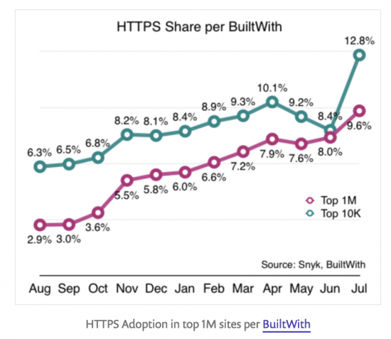 The privacy scares and increase in hacking attacks over the last few years have significantly improved HTTPS adoption. Between the need to show users that the application is secure and the need to comply with standards such as PCI-DSS, HTTPS adoption has pretty much broken the roof. In addition, Google's move to list sites using HTTPS higher on search results and the availability of easy to use tools to enable HTTPS has also helped.