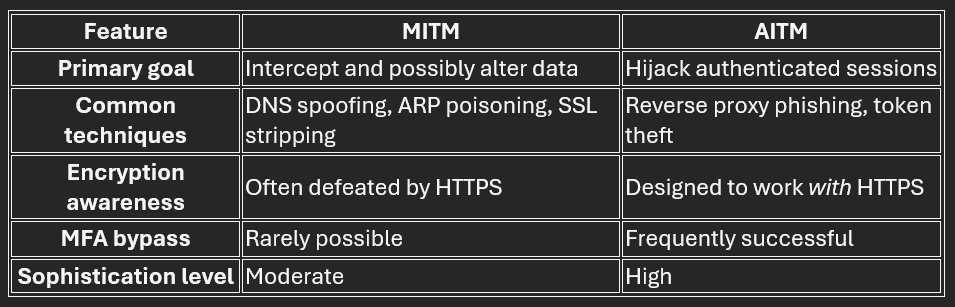 AITM attacks are particularly dangerous because they exploit trust at the application layer. Even if your organization enforces MFA, AITM can render it ineffective. Once an attacker has a valid session token, they can impersonate the user without needing to re-authenticate.