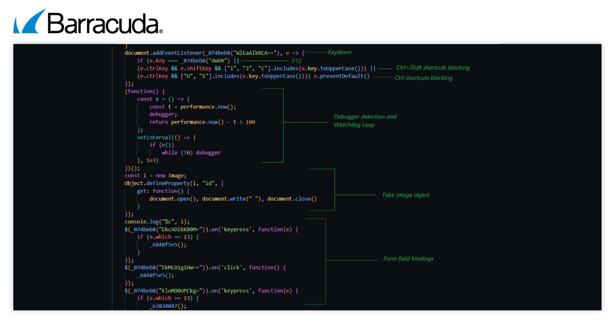 También incluye varias técnicas de antianálisis que bloquean las formas en que la mayoría de las personas inspeccionan las páginas web. Por ejemplo, desactiva los atajos de teclado como Ctrl+Shift+I, Ctrl+Shift+J, Ctrl+Shift+C (utilizados para abrir las herramientas de desarrollo), Ctrl+U (utilizado para ver el código fuente de la página), Ctrl+S (utilizado para guardar la página) y el clic derecho (utilizado para abrir el menú contextual).