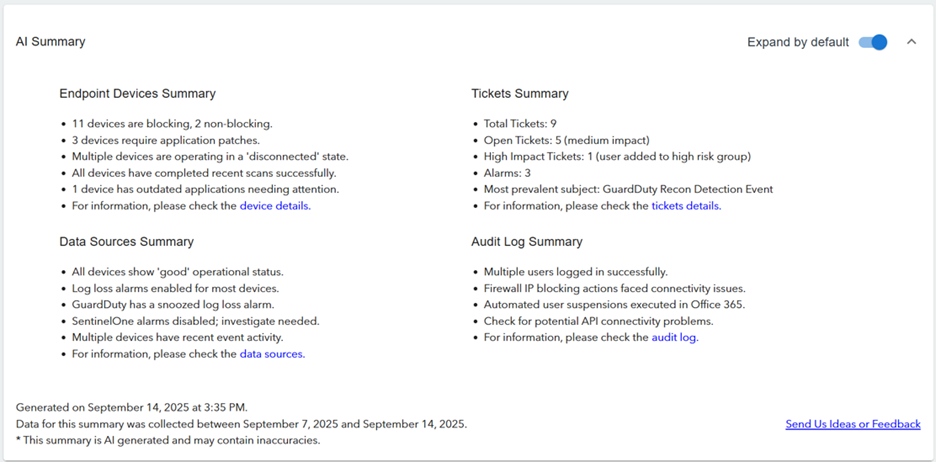 Now, AI dashboard summarization brings the most critical insights to the forefront. Using Barracuda AI, the dashboard automatically: