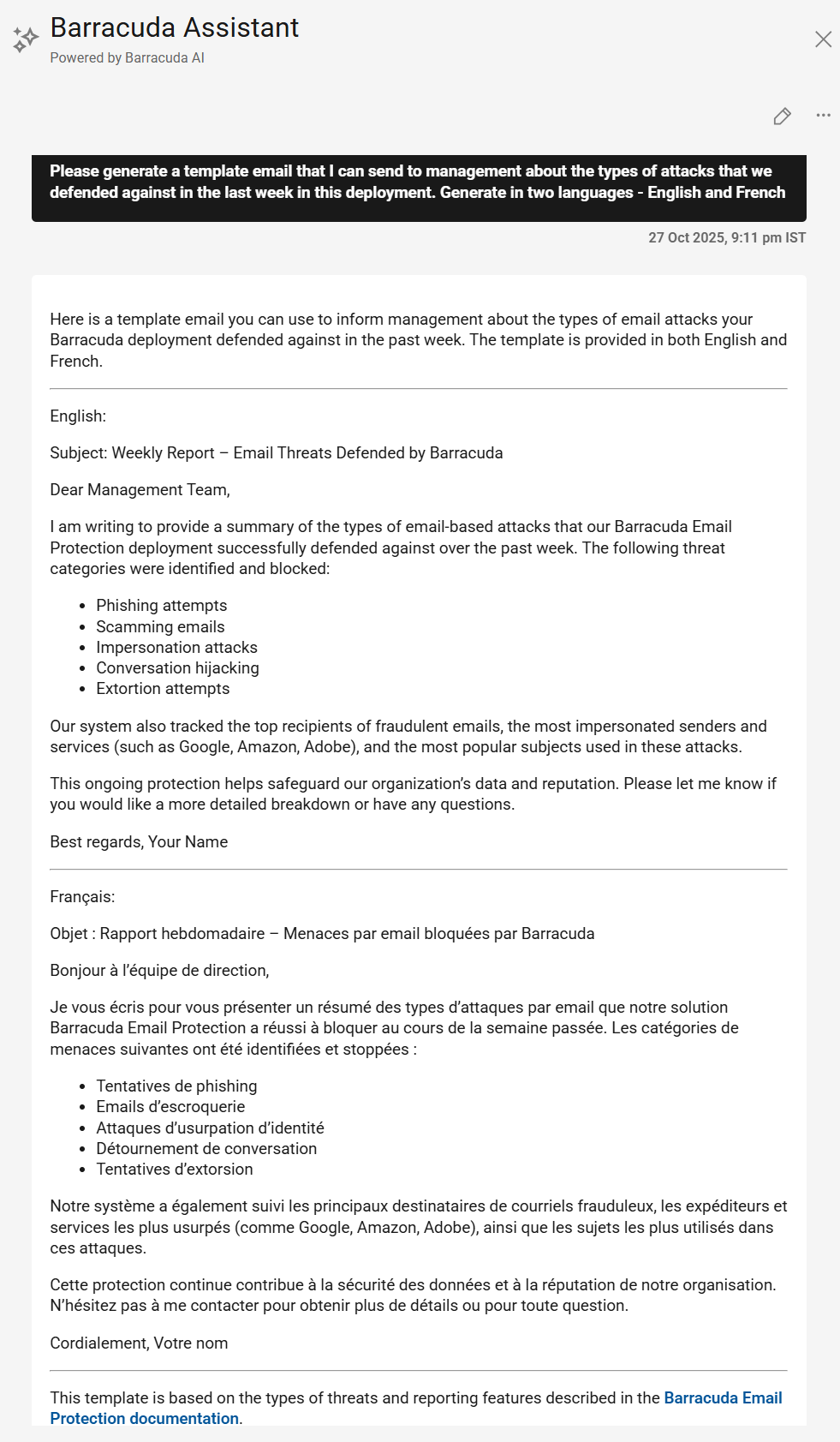 Barracuda Assistant prepara plantillas de correo electrónico según la solicitud del usuario.