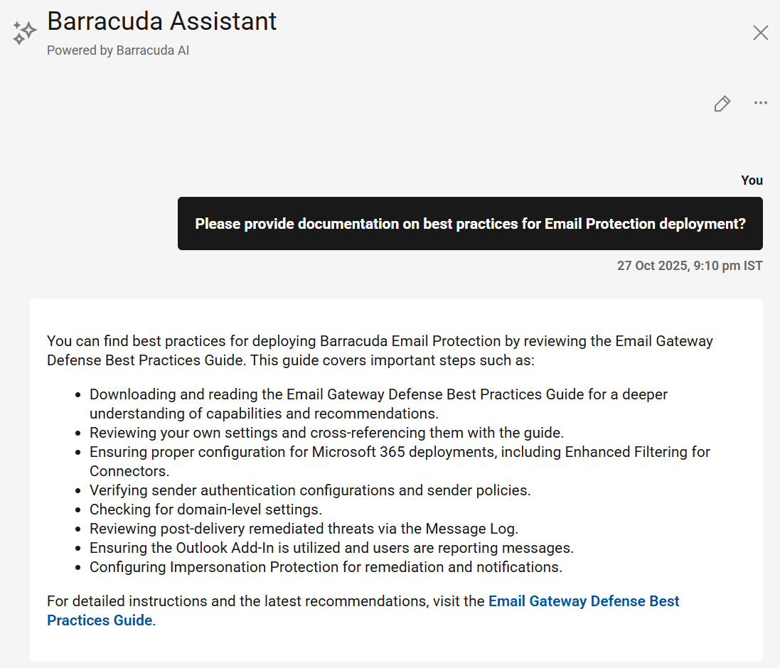 Barracuda Assistant proporciona documentación y enlaces a más información sobre el despliegue de Barracuda Email Protection.