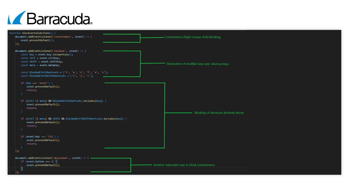 By targeting both mouse clicks and main context menu access, the phishing kit ensures there is no way to get to the context menu.
