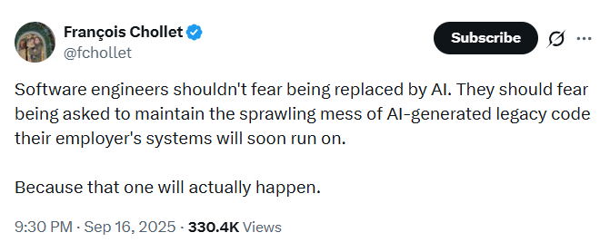 Francios Chollet, creator of the Keras deep learning library, puts this into much better context in the tweet above. The point is that software engineers will be fixing the AI-generated mess of ‘pesto cheeseburger fusilli pineapple spaghetti pizza code.’ Today, people are stuck maintaining bolted-on code written ages ago, using an Access database whose password is long forgotten. Or the regular articles that talk about how experienced Common Business-Oriented Language (COBOL) programmers who can understand the business logic are highly prized because no one else can understand and fix legacy systems.